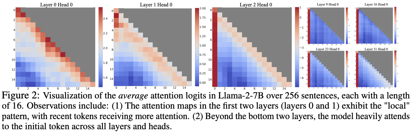 Models have a tendency to place a lot of attention on the initial tokens of the sequence, particularly in deeper layers. Why? Either the initial tokens hold significant detail to decoding the sequence, or the model learns a bias toward their absolute position. A simple experiment where the four first tokens are substituted with linebreaks ('\n') indicate that the model still emphasizes these linebreak tokens. This suggests that it is the position of the starting tokens that matter, rather than their semantic value. The authors term this concept attention sinks, and attribute this as a symptom of the SoftMax normalization. The model uses the sinks as a way to dump unnecessary attention weight which it doesn't want to distribute on "actual" tokens.