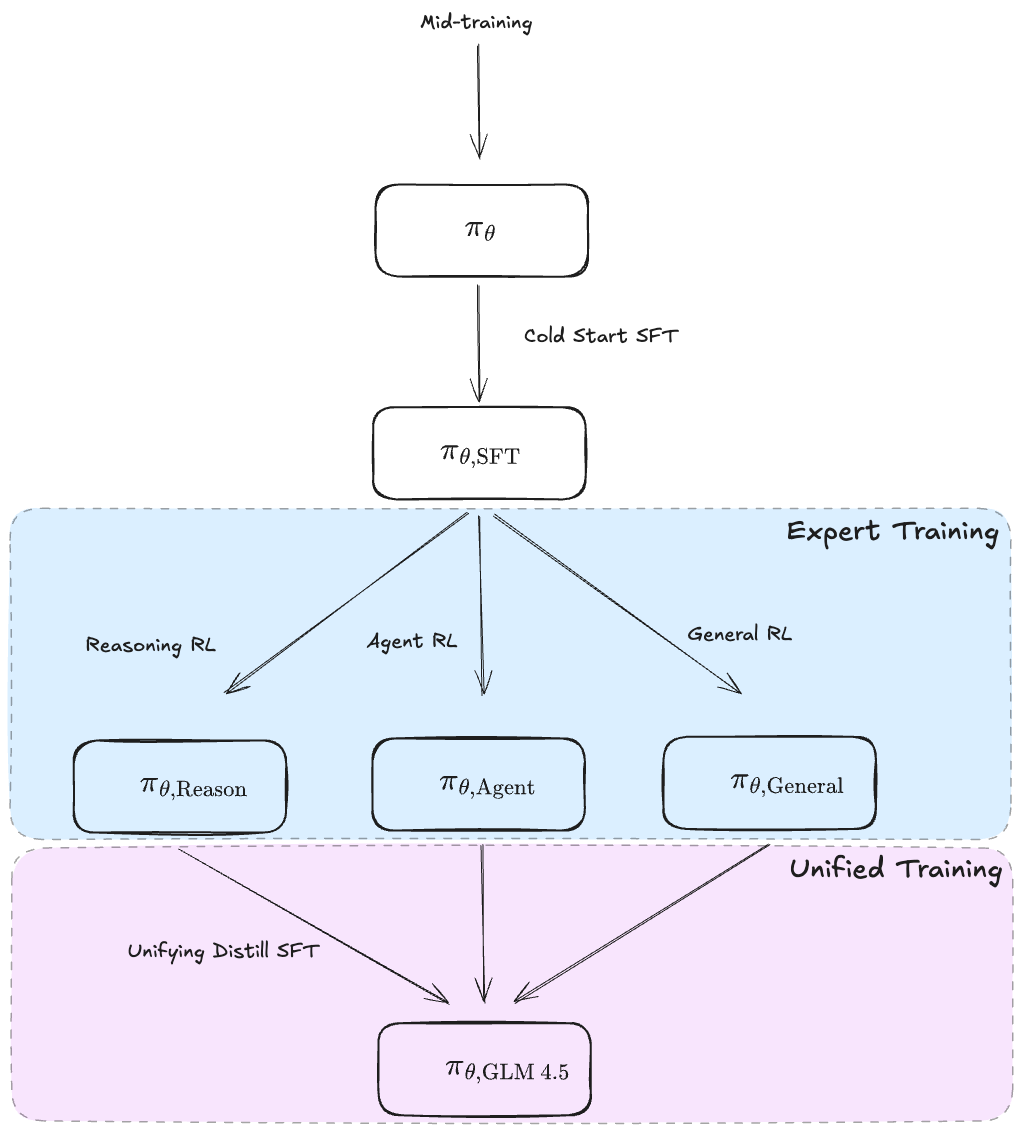 They train three separate expert models from a SFT cold start, specializing in the Reasoning, Agent, and General chat domains respectively. This part is really interesting. These experts are then combined through a self-distilling SFT stage, where the experts generate millions of samples covering their respective domains, and train a base model on these samples with a ctx length of 128k. The output is a hybrid reasoning model. I haven't seen this before, granted I've been bad at reading model papers for the past few months, very interesting. RL is notoriously difficult to get right, and RL on agentic tasks with tool use may look quite different from RL on mathematical problems which makes things even more finnicky. I remember seeing papers talking about this problem, and trying to RL in sequential stages has the problems of destroying the previous stage, so this is a clean way to completely separate the RL. You get three clean individual RL environments where you don't have to worry about the others, you can design the pipelines completely individual, curated for the specific domains then combine them in the unifying SFT stage.