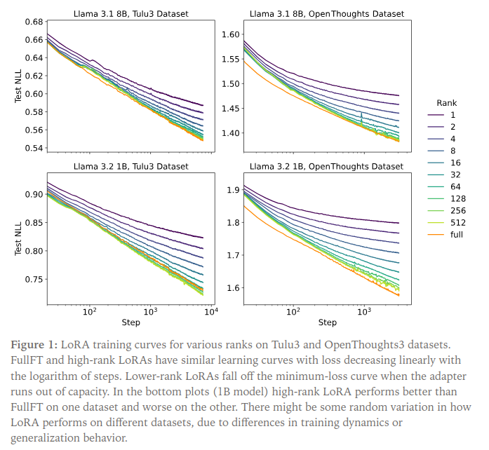 Training on Tulu-3 and subsets of OpenThoughts-3, FullFT and high-rank LoRAs show near-identical linear log-loss decay. Lower-rank LoRAs eventually flatten, reflecting insufficient capacity—once the adapter saturates, the model stops improving.