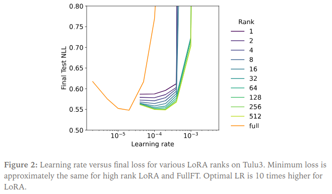 Interestingly, optimal learning rates vary little with rank: lower ranks favor slightly smaller LRs, but overall variation stays within a factor of two between ranks 4–512. FullFT, however, converges best at a learning rate roughly an order of magnitude lower than LoRA’s.
