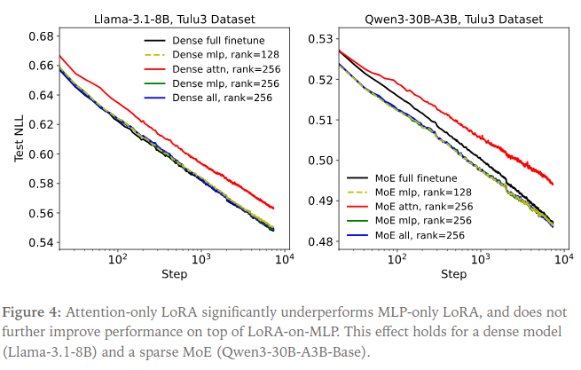 Practitioners often follow the original LoRA paper’s convention of applying adapters only to attention matrices (). However, LoRA Without Regret finds this suboptimal. Applying LoRA to MLP layers alone achieves the same minimum loss as full MLP+attention LoRA, while attention-only LoRA significantly underperforms. For MoE architectures, the authors train per-expert LoRA modules, scaling rank by the number of active experts to maintain a constant LoRA-to-FullFT parameter ratio.