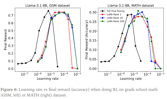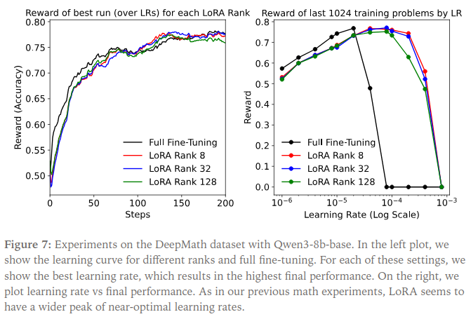 Follow-up experiments with Qwen3-8B-base on DeepMath confirmed the same trend: LoRA matches FullFT performance at ranks as low as 8, with a wider plateau of near-optimal learning rates.