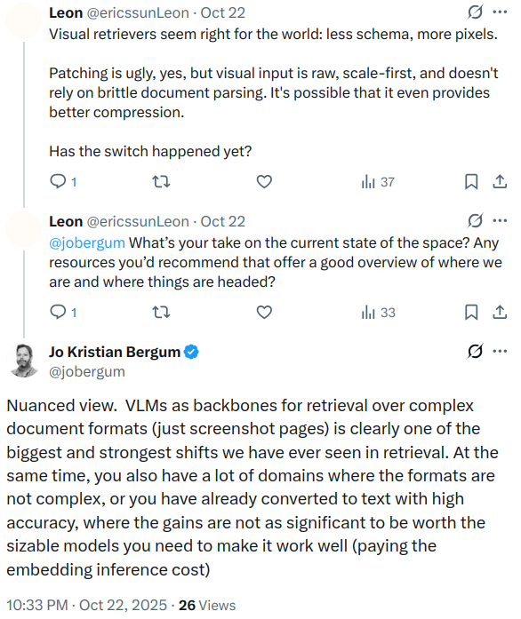 My initial hypothesis was that visual systems should overtake text-only alternatives for real world applications. Documents are messy, real-world systems operate on PDFs, slides, and scanned images filled with charts and complex layouts, not clean text files. As Jo points out however there are still domains where formats are not complex and converting to text is possible with high accuracy.